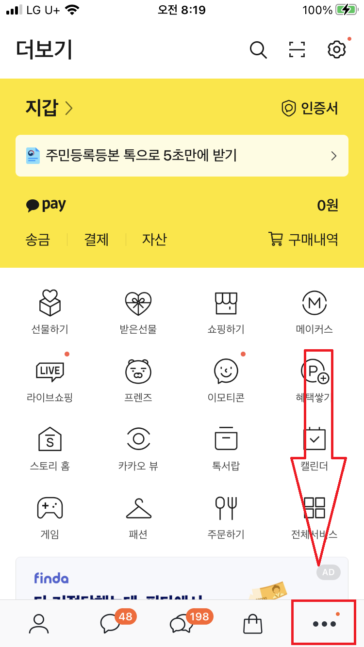 1. 카카오톡에서 하단 점 3개 메뉴를 터치합니다. 터치 후에 지갑을 터치합니다. 지갑 메뉴에 들어가면 전자증명서를 터치합니다.