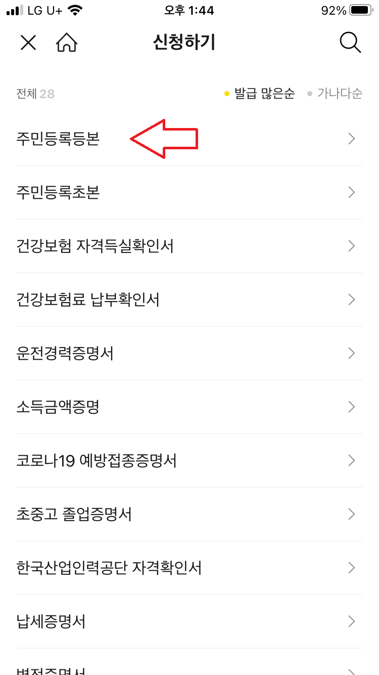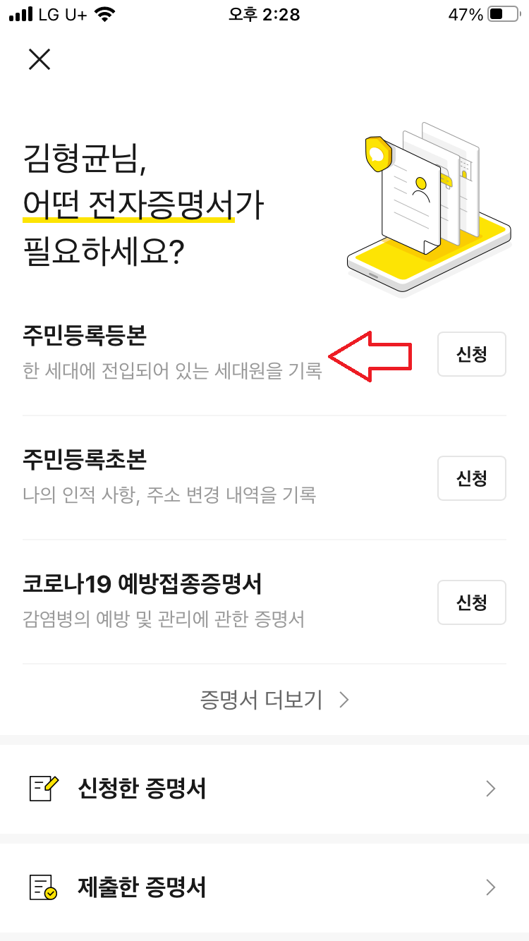 카카오톡 지갑 주민등록등본 발급방법