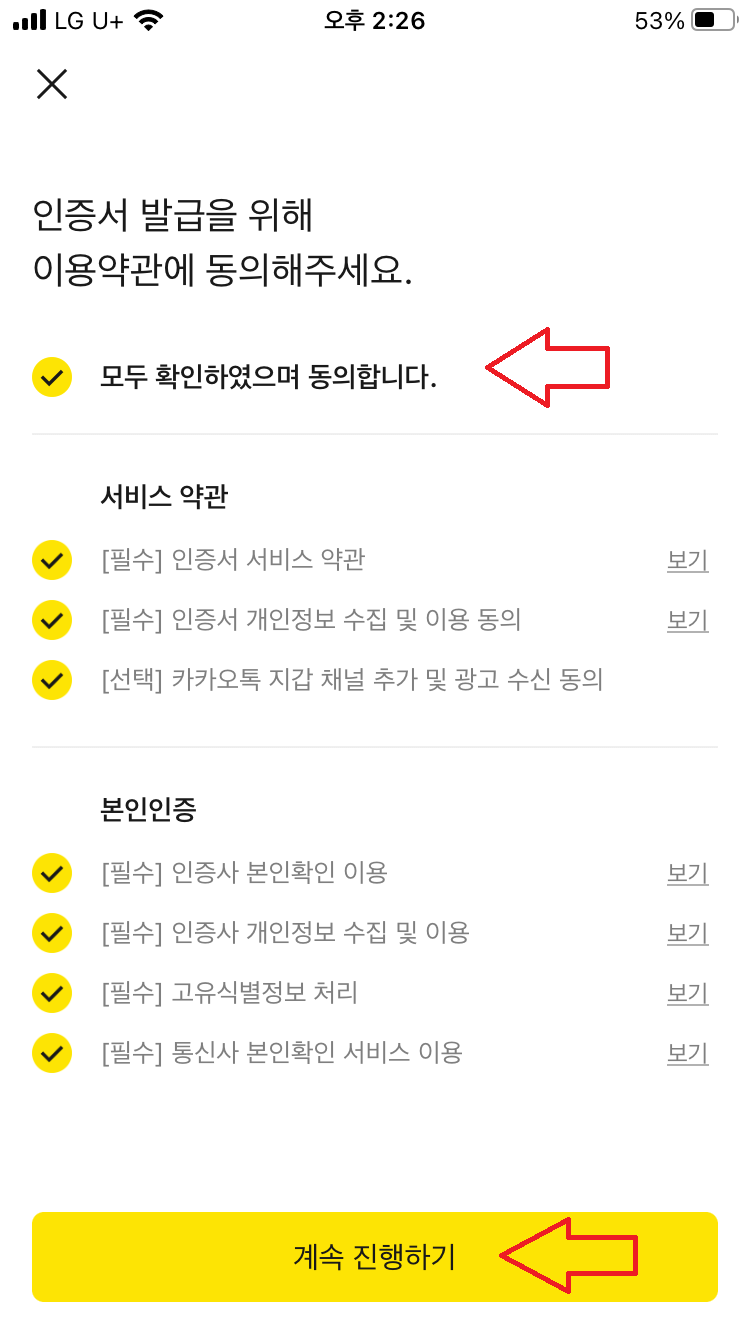 본인 인증을 시작하면 전자증명서 이용을 위한 서비스 약관 동의를 하게 됩니다. 다음으로는 각종 이용약관에 동의를 해야 합니다. 모두 동의 후에 넘어가시면 됩니다. 마지막으로 은행 계좌를 통해 본인 인증을 하면 됩니다.